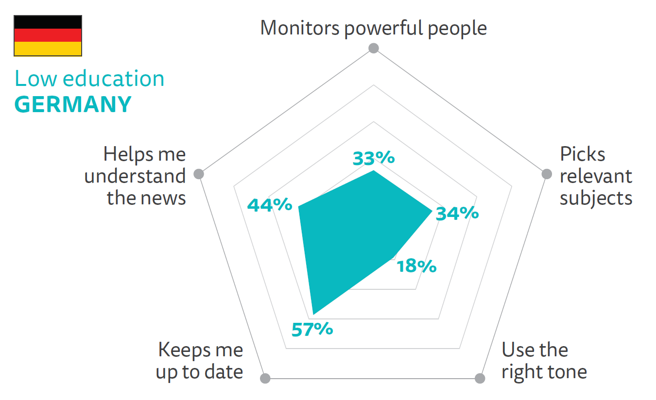 We can also see differences between groups within countries. If we look at differences by education, in the UK and Germany we can see that those with higher levels of formal education are more likely to evaluate the news media positively along every dimension. Those with lower levels of education are, for example, significantly less likely to say that the news media cover topics that are relevant to them, suggesting that the news agenda is more geared towards the interests and needs of the more educated. This chimes with the criticism that the news media do a better job of catering for people who are most similar to the journalists themselves, and are less able to serve those groups that are less likely to be found in the newsroom.