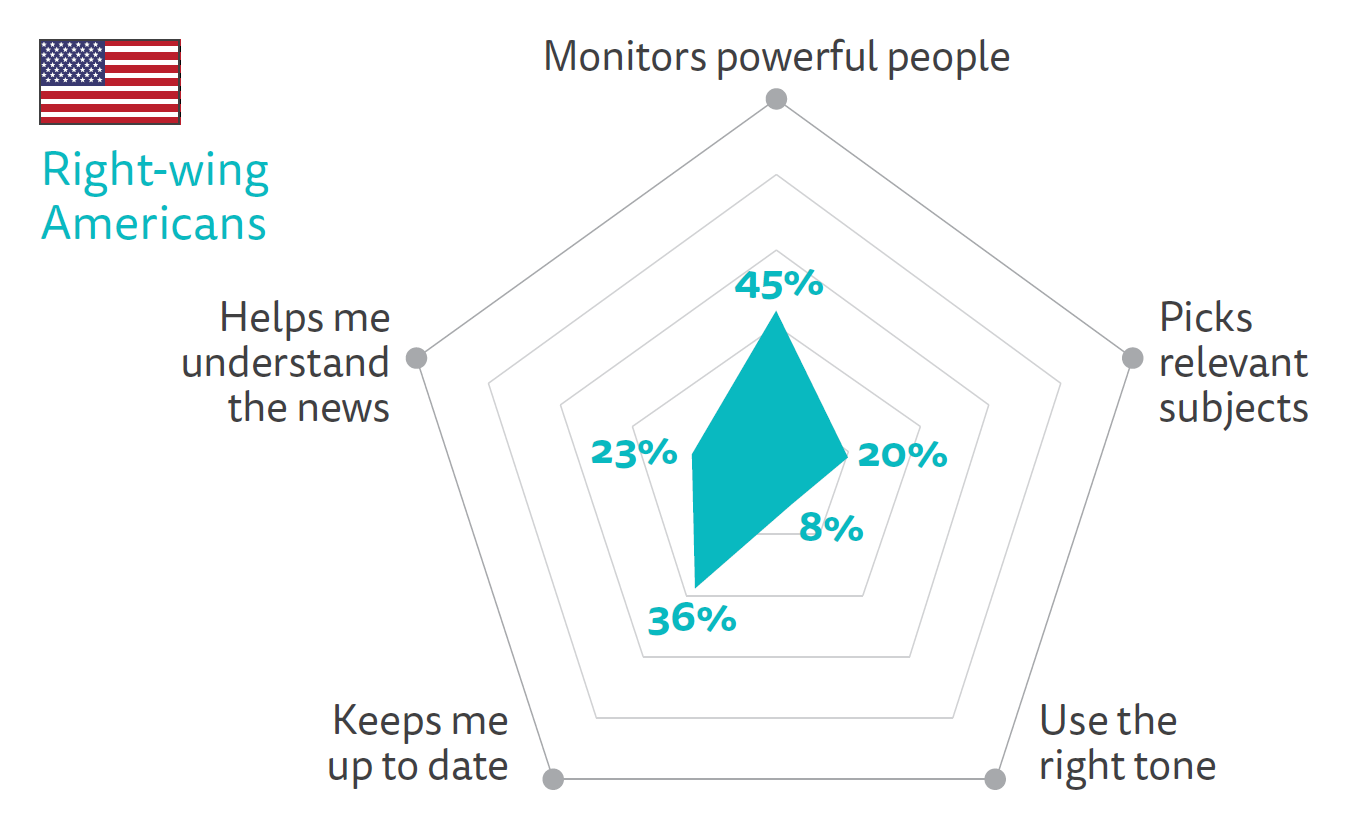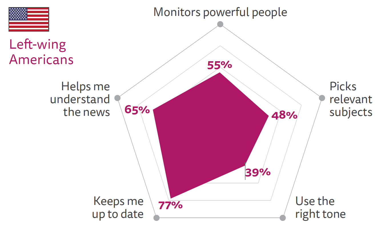In the US, people’s evaluations are much more likely to be shaped by their political views – reflecting the highly politicised nature of attitudes towards the news media. As illustrated below, right-wing Americans evaluate the news media very negatively – even more negatively than in countries with low trust in the news like Hungary and Greece. Conversely, left-wing Americans are more positive towards the news media than high-trust countries like Finland and Canada. The most striking differences surround attitudes towards help with understanding: 65% on the left think that the news media do a good job in helping understand the news, whereas only 23% of right-wing Americans think the same.