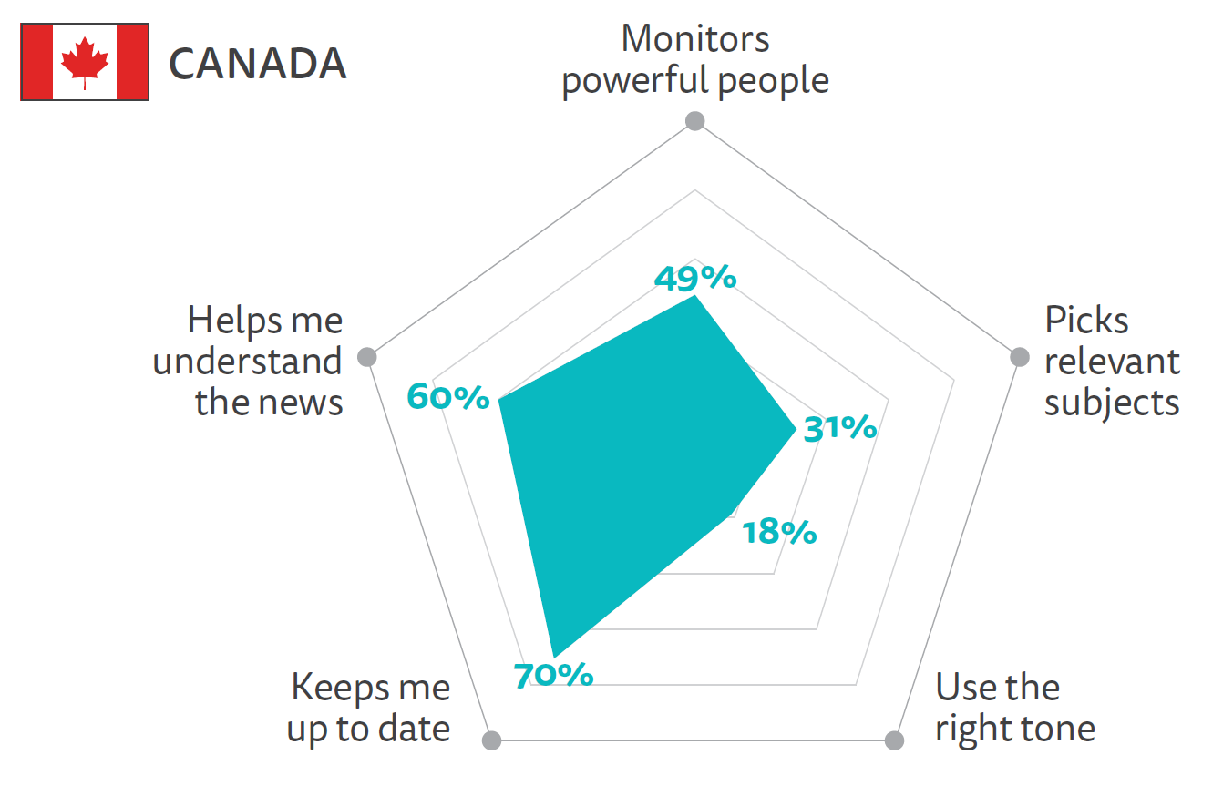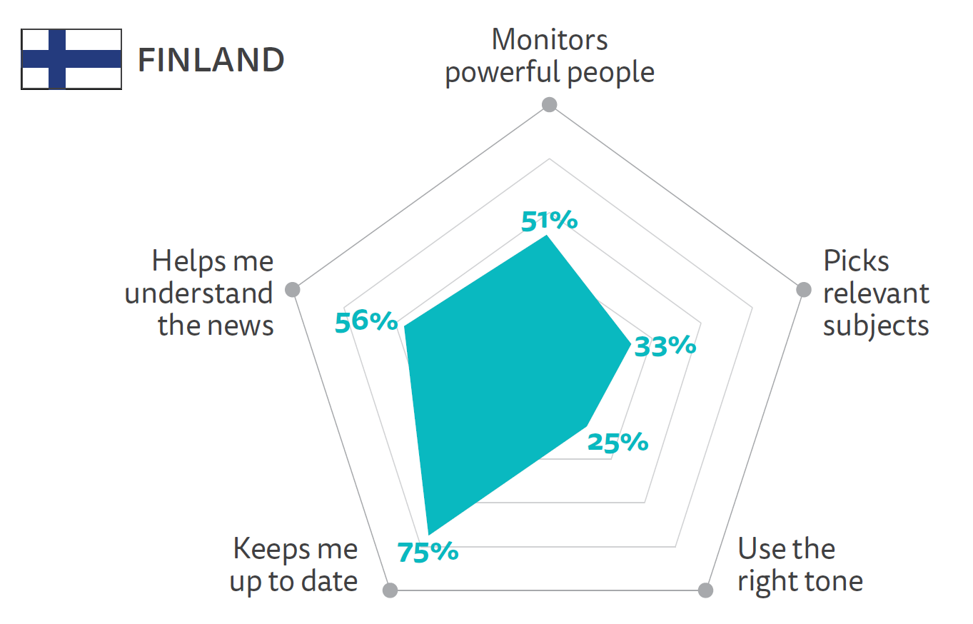 In Finland and Canada, roughly half of respondents think that the media do a good job in monitoring powerful people and helping them understand news, whereas in Hungary only one-fifth of respondents (20%) think that the news media fulfil their watchdog role, and a third (33%) that they help them understand the news.