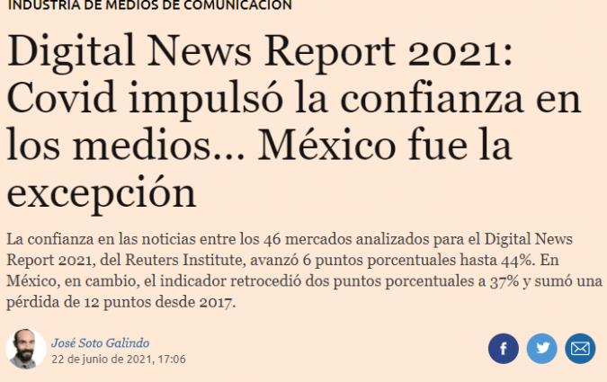 The Reuters Institute in the News In the news El Periodico RISJ Head of Editorial Eduardo Suárez speaks to Catalan newspaper in article about subscriptions In the news LatAm Journalism Review Trust in News project report covered by Knight Center outlet In the news BBC's Climate Question Visiting Fellow Wolfgang Blau takes part in BBC podcast on climate change to discuss climate reporting In the news MediaPost Media and marketing company article on our Trust in News report In the news DW Portuguese site of German broadcaster covers report from our Trust in News Project. In the news Time RISJ Director Rasmus Nielsen interviewed for Time article on a Brazilian law banning removal of certain content. In the news Journalism.co.uk Journalism news site article on our Trust in News research. In the news El País Spanish daily shares findings from our Trust in News project. In the news Newslaundry Indian digital news site covers our Trust in News report In the news The Quint Indian digital-born news media site covers our third Trust in News project report In the news Nieman Lab Report from our Trust in News project covered by Nieman Lab. In the news Digiday Media-focused digital news site references DNR research on subscriptions In the news BBC's The Media Show Deputy Director of the Reuters Insitute Meera Selva joins the panel on the BBC's Media Show discussing reporting from China In the news CNN CNN article on diversity includes findings on trust in American media from the Digital News Report In the news Nieman Lab Visiting Fellow Wolfgang Blau writes on journalism and climate change for US media news site In the news BBC British public service news covers findings from our Digital News Report 2021 In the news Reuters UK news wire covers our Digital News Report 2021 In the news The Economist News magazine covers our Digital News Report 2021 In the news El Economista Mexican business newspaper covers our Digital News Report 2021 In the news El Mundo Spanish daily covers our Digital News Report 2021 In the news Poynter US media website looks at our Digital News Report 2021 Load More