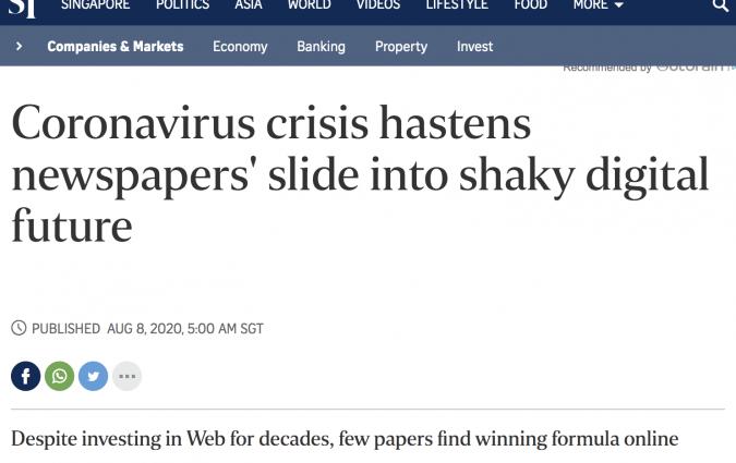 In the news Singapore Straits Times Singapore daily discusses how the pandemic is accelerating trends in news consumption, citing Digital News Report 2020 research